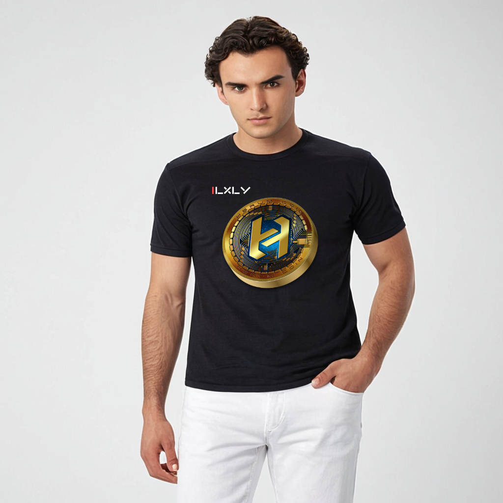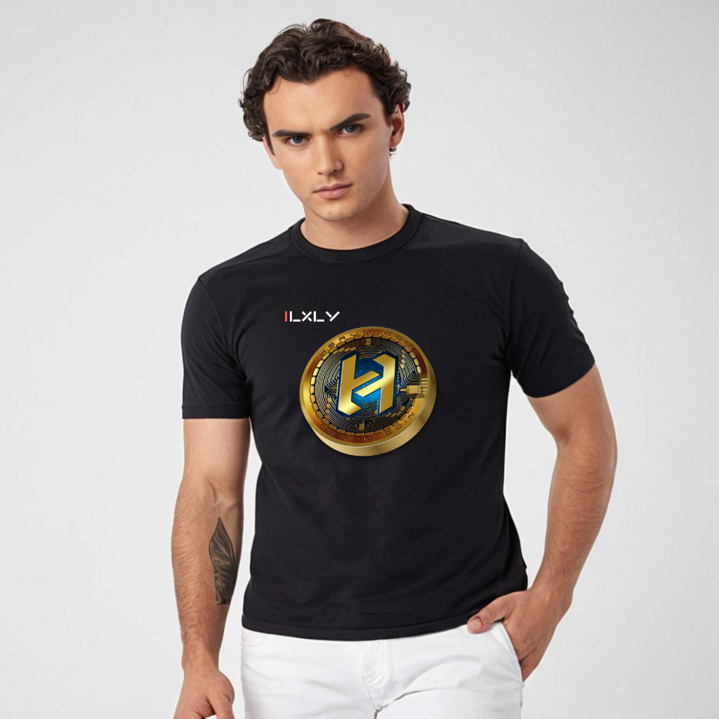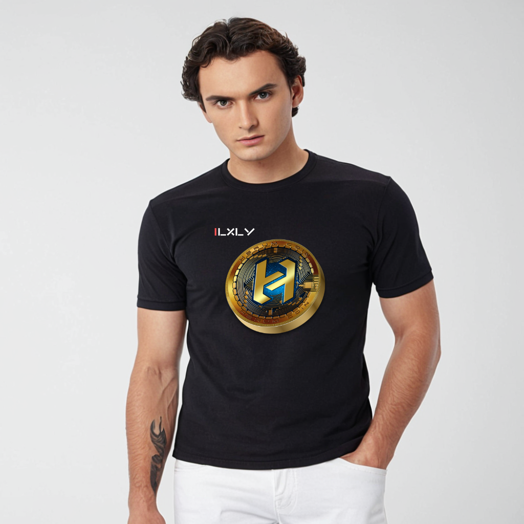 Timeless black crew neck T-shirt for men, featuring ILXLY’s premium quality and Herum Coin branding. Soft, durable, and perfect for everyday wear.