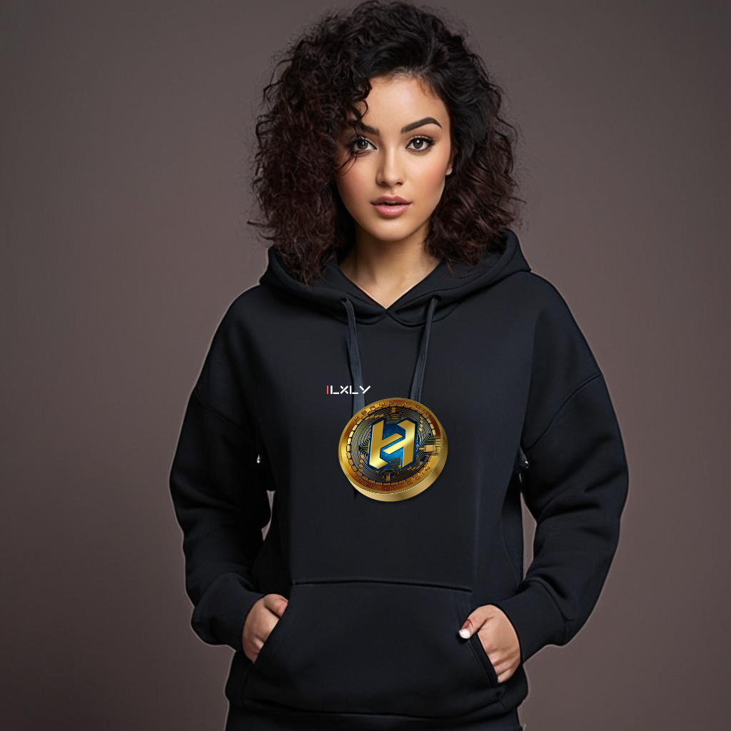 Classic women’s black hoodie featuring ILXLY’s premium quality and Herum Coin branding. Cozy, stylish, and perfect for everyday wear.