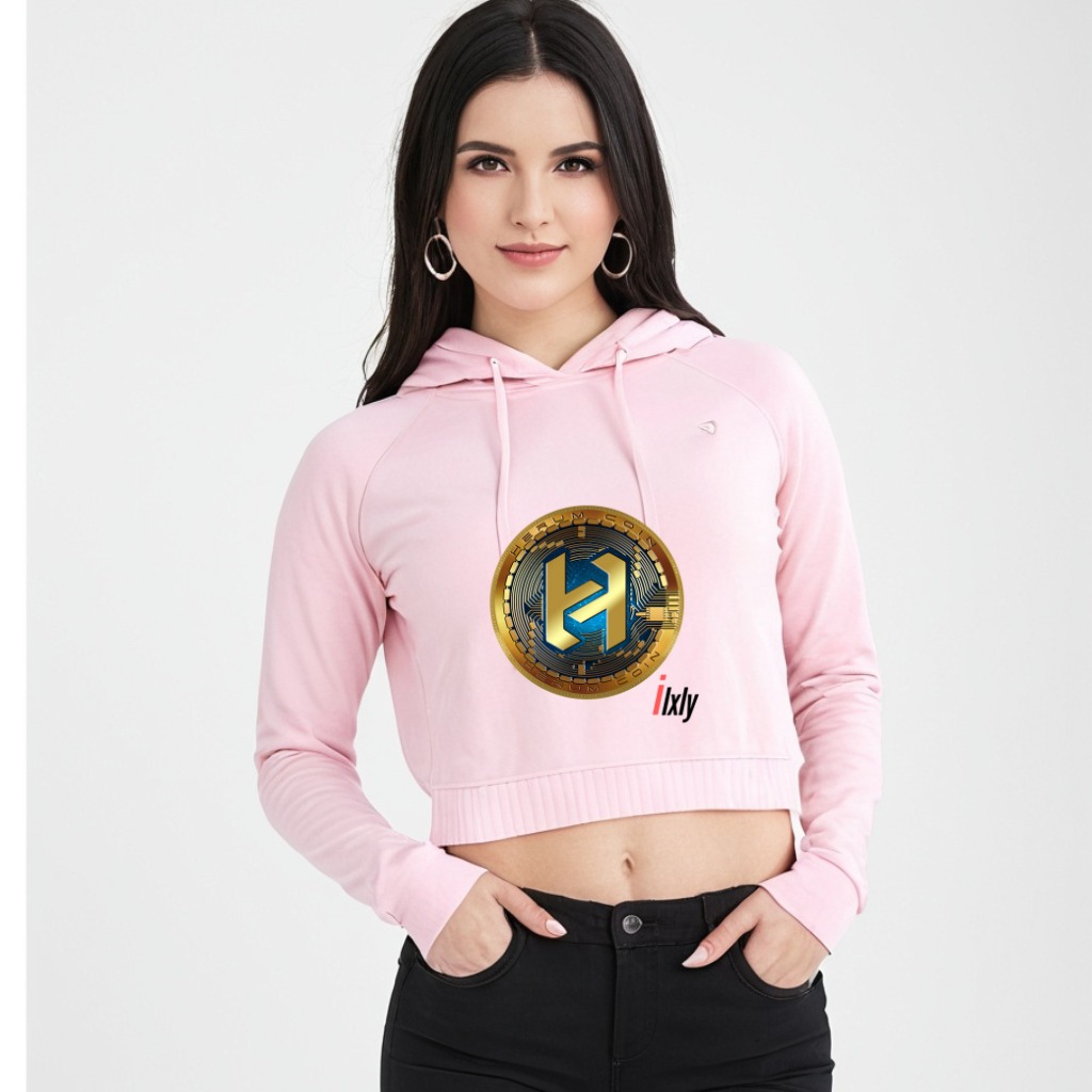 Trendy women’s cropped hoodie in light baby pink, featuring ILXLY’s premium quality and Herum Coin branding. Soft, stylish, and perfect for casual wear.